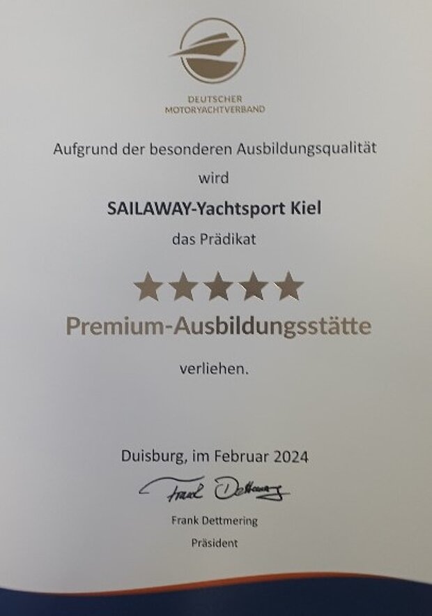 Bei strahlendem Frühlingswetter wurde am 20. April 2024 Dirk Buske mit seiner Ausbilder-Crew von Sailaway-Yachtsport als erste Premium-Ausbildungsstätte des DMYV an der Ostsee ausgezeichnet. Vom DMYV anerkannte Premium-Ausbildungsstätten erfüllen besonders hohe Qualitätsstandards bei der Ausbildung zum Ablegen der Prüfung für den Erwerb der Führerscheine und Funkzeugnisse.